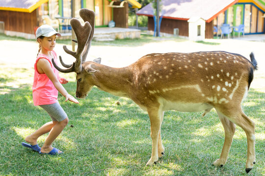 Child Feeding Wild Deer At Petting Zoo Kids Feed Animals At Outdoor Little Girl Watching Reindeer On A Farm Kid And Pet Animal Family Summer Trip To Zoological Garden Herd Of Deers